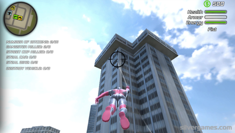 Amazing Rope Hero is a fascinating third person open world game about a strange type of superhero with powers similar to Spiderman’s and you can play it onlie and for free on Silvergames.com. Enter this chaotic Vice Town and control this masked character to fight against criminals and police trying to stop you. Complete missions, like collecting bitcoins or stealing different kinds of vehicles and use your special powers to climb buildings or to kill people with a super lethal ray that comes out of your eyes. The revolution has started and the fate of the citizens is in your hands.