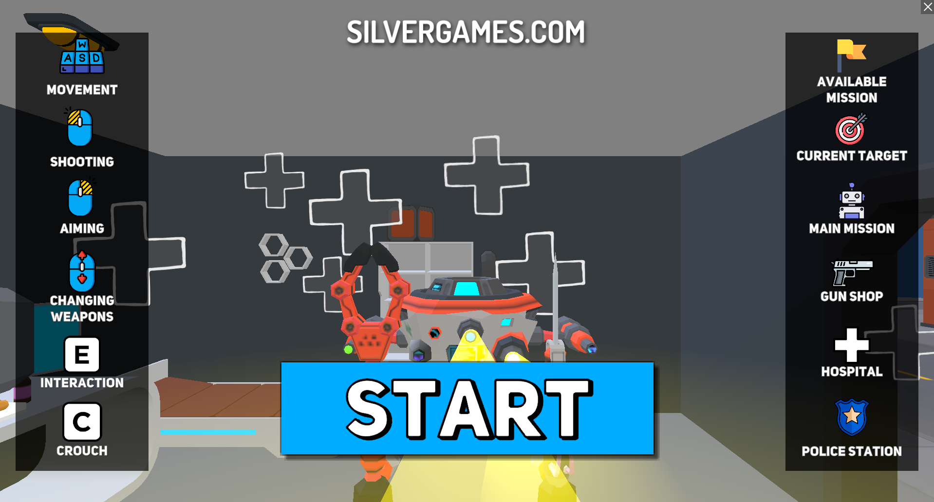 Controls: WASD = move, Mouse = aim/shoot, Shift = run, Space = jump, E = interact, C = crouch