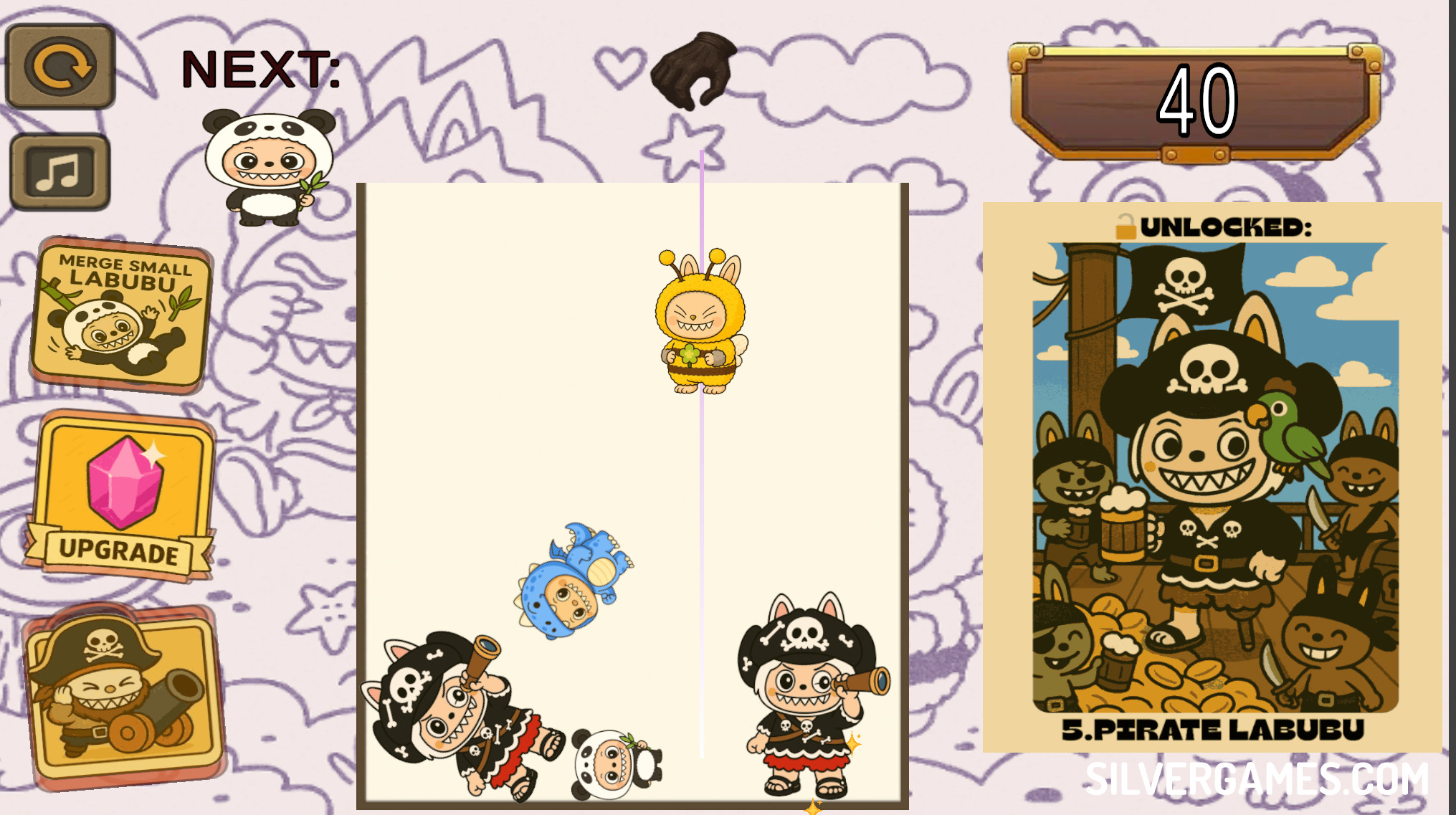 Labubu Merge Clicker is a fast-paced merging game where you drop and combine quirky Labubu monsters to discover new forms and score big. Your goal is to manage a constantly filling box by dropping Labubus into it, merging identical ones to evolve them into rarer, more powerful versions. The more you merge, the higher your score climbs — but be careful, because once the box overflows, it's game over. Use your keyboard (A/D or arrow keys) or click with your mouse to control where each Labubu drops.