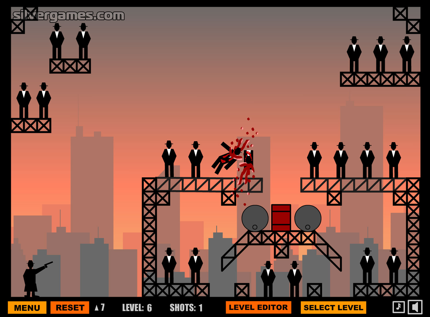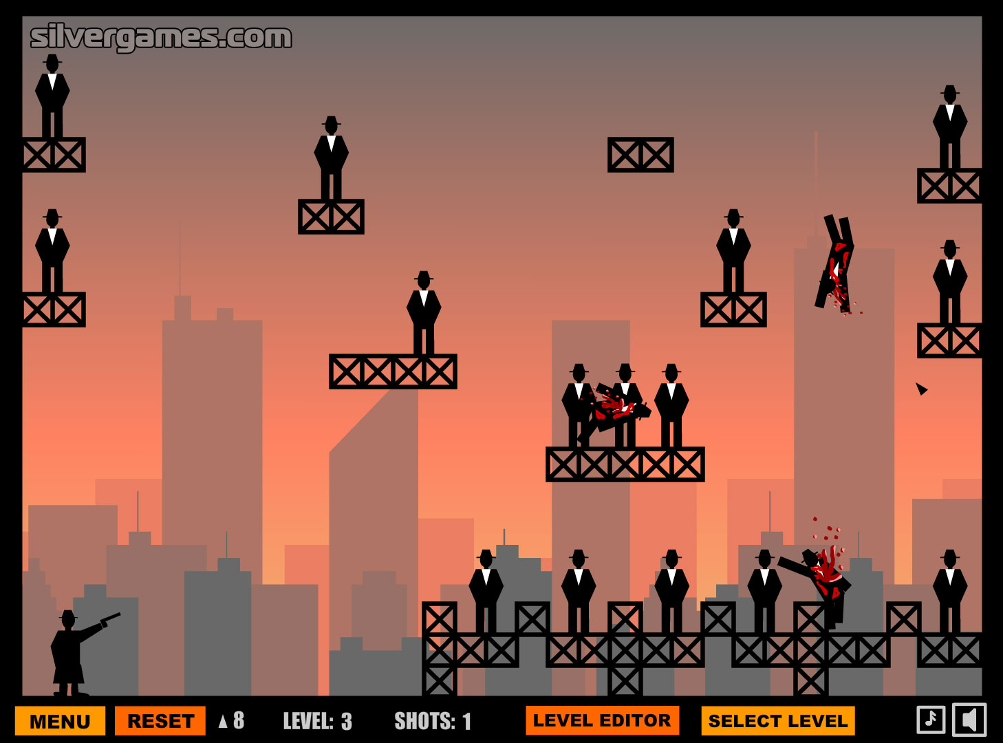 Ricochet Kills 2 is a physics-based shooting game. Try to kill all enemies with as little bullets as possible. Aim and shoot with your mouse. Use objects and walls to bounce bullets. You only have a limited amount of shots for every level, so try to catch as many as possible with just one shot, otherwise you'll run out of arrows and have to replay the level.