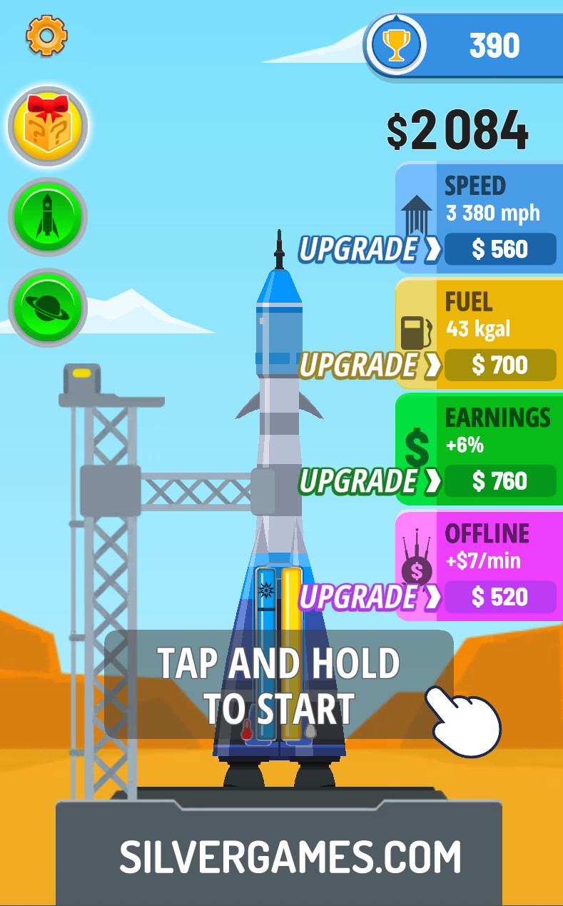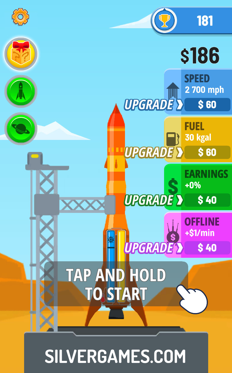 Rocket Sky! is a one-touch launch game where you blast rockets as high into the sky as possible while upgrading their power and performance. Press and hold to launch your rocket upward, but keep an eye on the heat gauge — if it overheats, your flight ends early. The farther your rocket travels, the more coins you earn, which you can spend on upgrades like fuel capacity, launch speed, and heat resistance. Each improvement lets your rocket soar higher and longer on the next attempt.