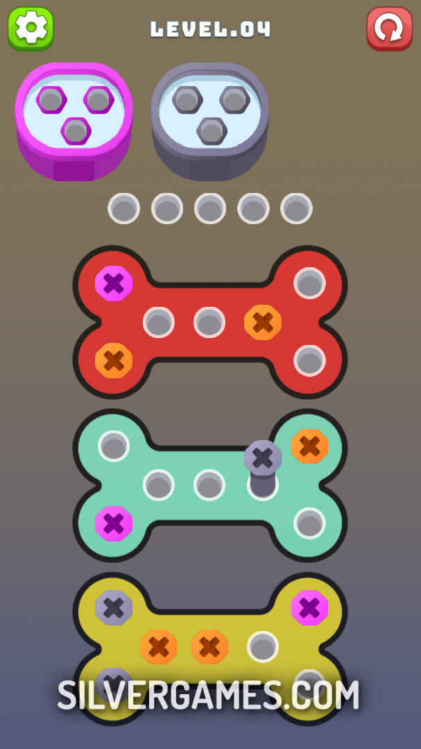 In every workshop, one valuable rule must be respected to keep everything under control. That rule is to keep things in order, especially for small parts like screws. That is precisely what this engaging logic game is all about, so you will have to find the correct order to remove each of the screws from the different figures. You will feel great satisfaction watching the figures fall free and the screws being stored in their respective boxes. Have fun playing Screw Pin Jam Puzzle!