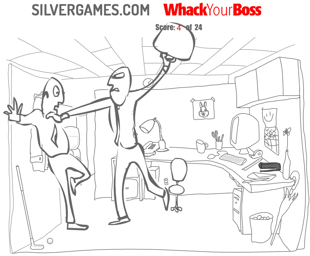 Whack Your Boss is a morbidly fun boss fighting game. Make an emotionally unstable, psychopathic employee turn everyday office items into deadly murder weapons. Watch him beat, bludgeon and skewer his boss with all kinds of objects, lying around at the workplace. Explore your character's workplace to find new ways to kill, maim or whack your boss during business hours. Watch your co-workers flee in horror. Laugh at the sadistic and gruesome ways the physical attacks on your boss turn lethal. It's all the makings of a serial killer, from beating, shooting and just wacking an unsuspecting boss.