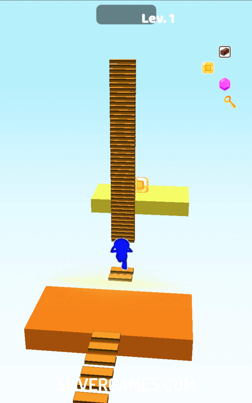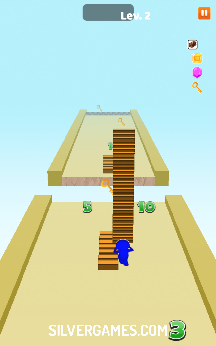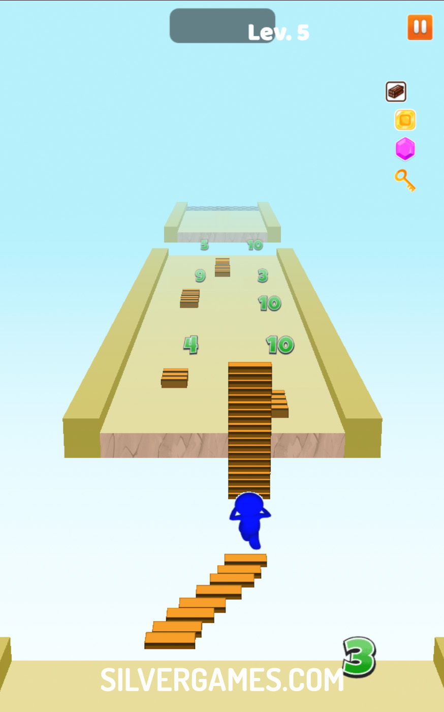 Bridge Run challenges players to a thrilling adventure where they must collect steps to construct bridges and navigate treacherous gaps. Using either the mouse or their finger, players move their character from left to right, strategically collecting blocks and numbers to increase their stack of steps. With each gap they encounter, quick decision-making is key to ensure they gather as many steps as possible.