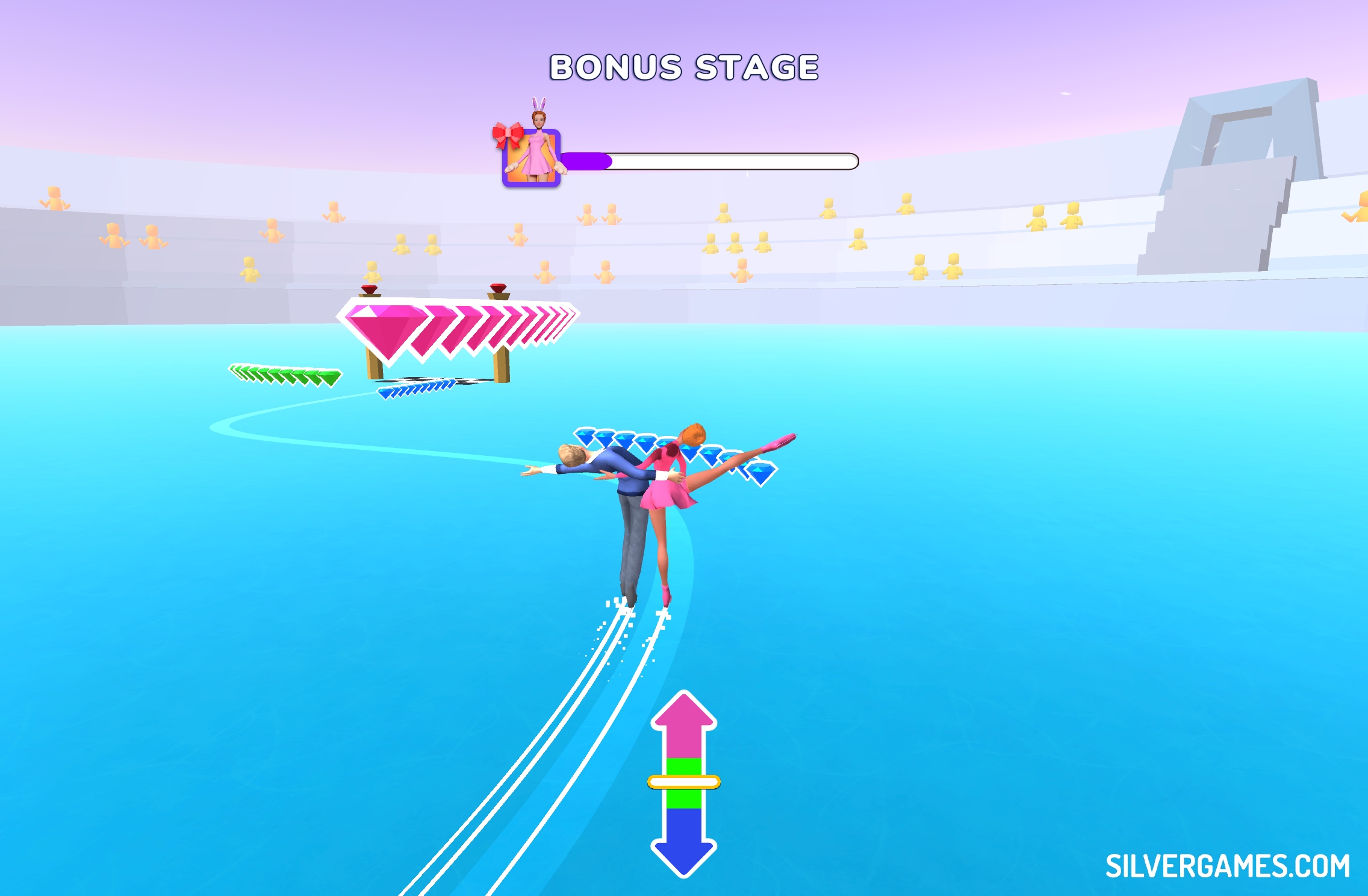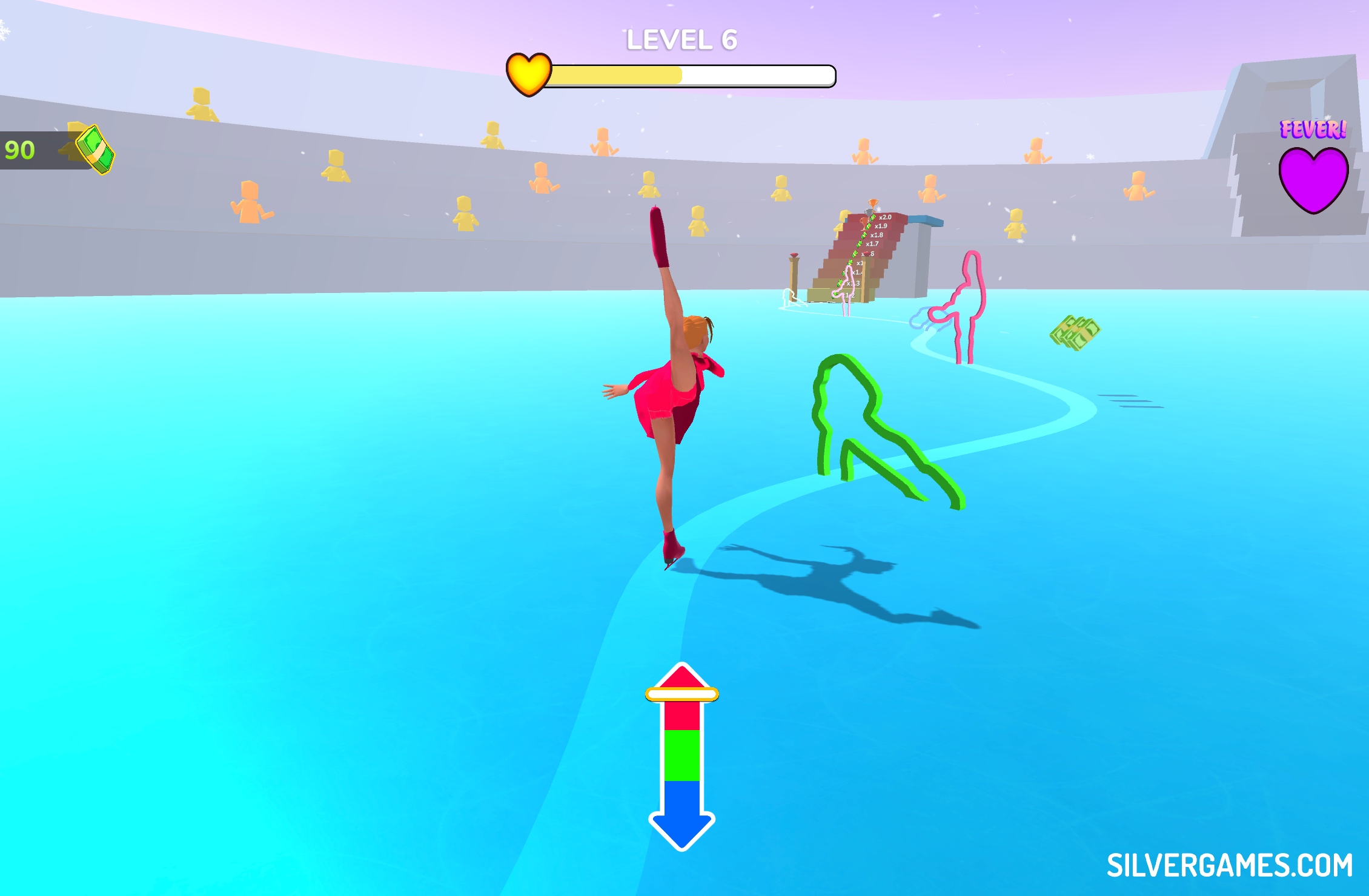 Reach the finish line with the maximum amount of points. Activate the screen by tapping it or clicking the mouse. Move the indicator along the scale until it reaches the desired colour. The figure skater will strike a pose depending on the position of the indicator. Perform graceful spins, jumps, and routines. Upgrade your athlete with earned points. Buy new outfits and unlock new stunts. Have fun!
