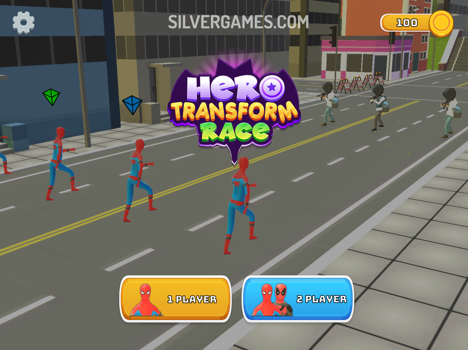 Hero Transform Race is a fun 3D parkour-style racing game where you sprint through obstacle courses and switch between superhero forms—like Hulk, Spider‑Man, Flash, Iron Man, and more—to tackle each challenge efficiently. Pick the right hero at the right moment: fly over gaps, smash through barriers, climb walls, or dash at super speed. With up to 14 different heroes unlocked by winning races, your success depends on quick reflexes and smart transformations. The game offers solo mode and local two-player, letting you compete alone or share the action with a friend.