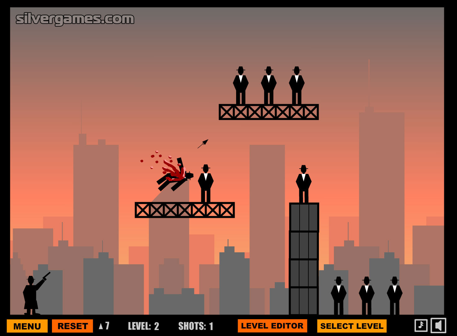 Ricochet Kills 2 is a physics-based shooting game. Try to kill all enemies with as little bullets as possible. Aim and shoot with your mouse. Use objects and walls to bounce bullets. You only have a limited amount of shots for every level, so try to catch as many as possible with just one shot, otherwise you'll run out of arrows and have to replay the level.