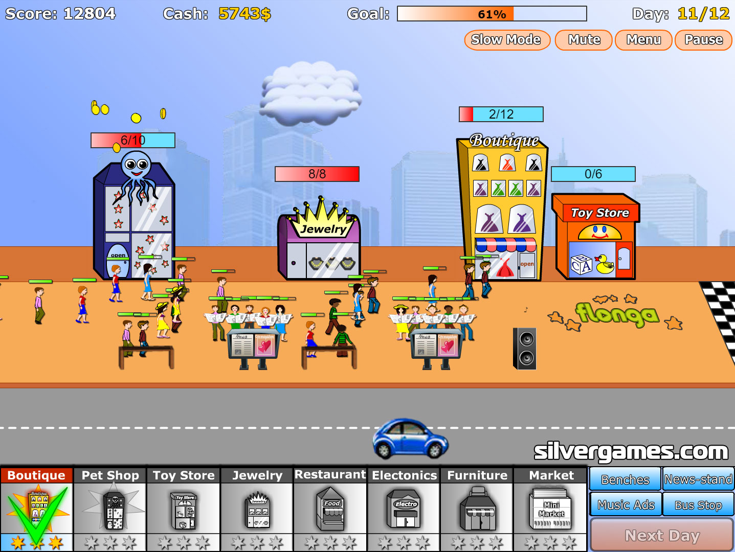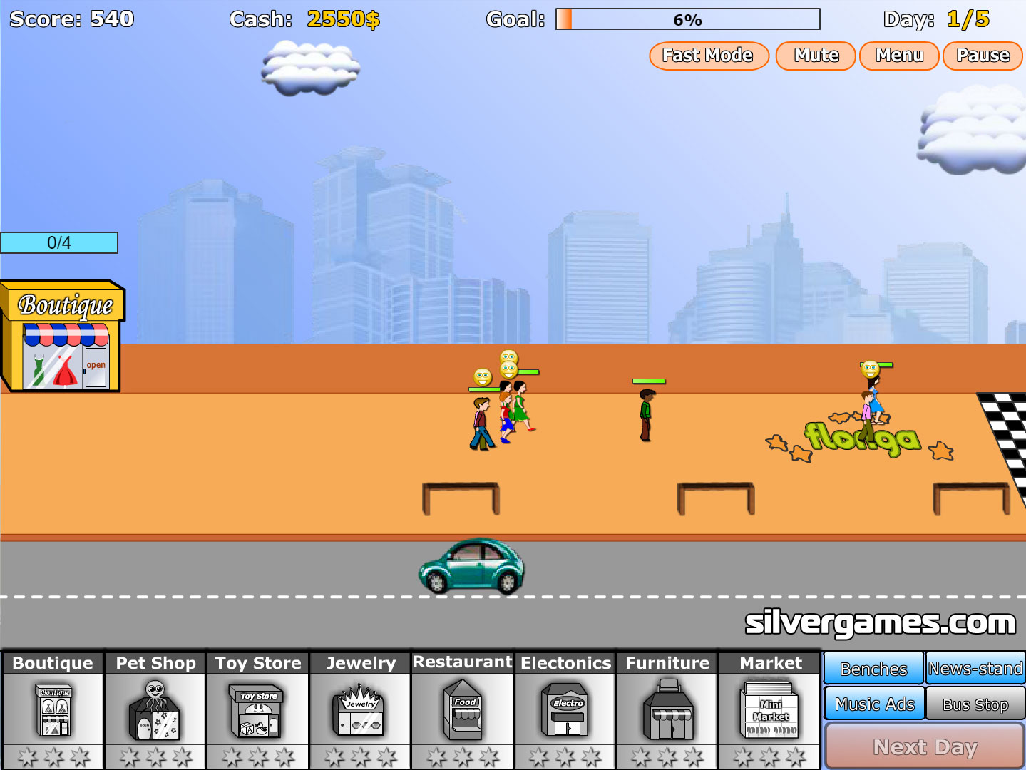 Build your first store, such as a clothing store or a pet shop and try to make enough money in a limited amount of days so you can buy more stores and reach your aim every time. Have fun playing Shopping Street online and for free on Silvergames.com!