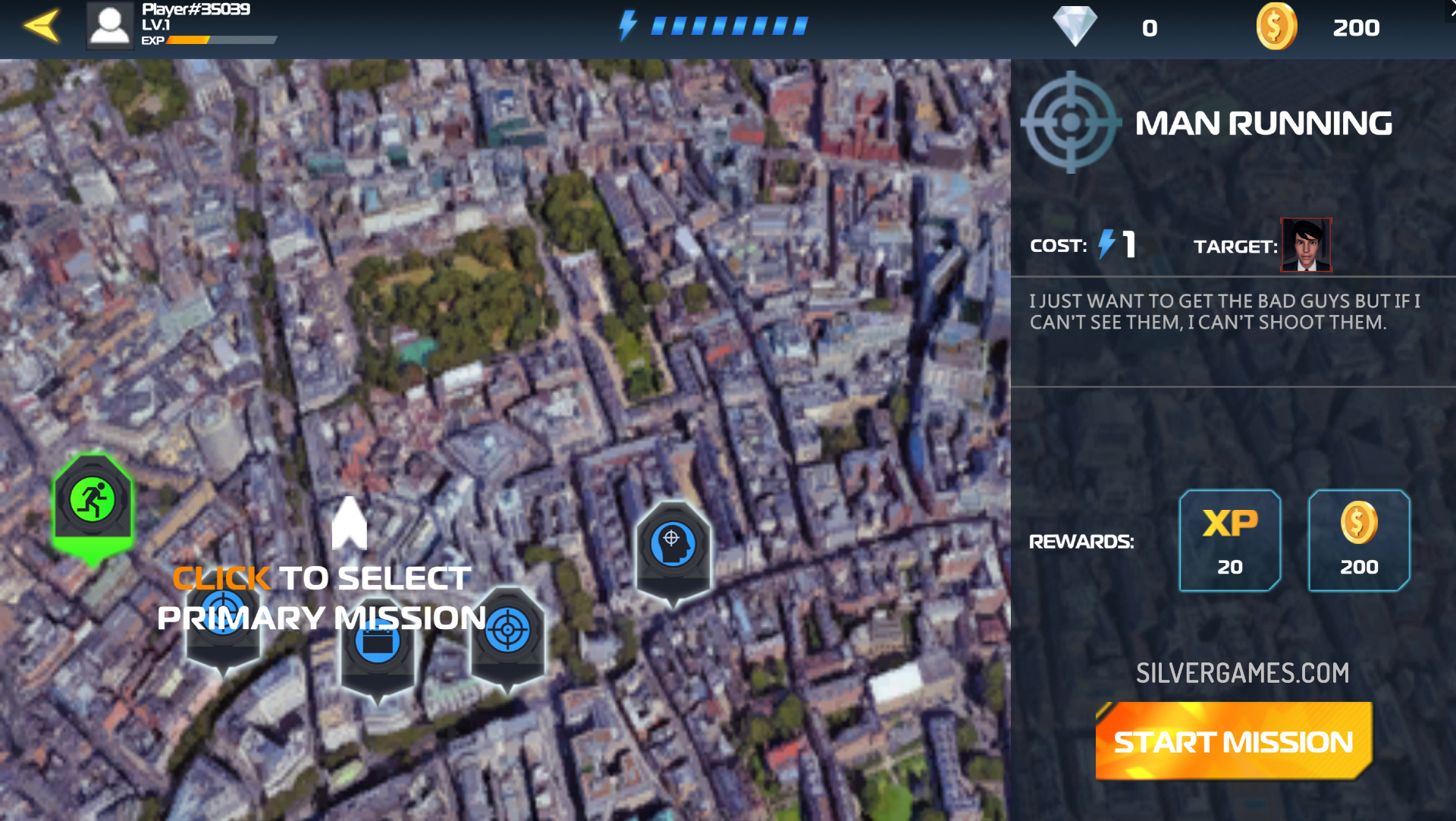 Sniper 3D is a first person aiming and shooting game and you can play it online and for free on Silvergames.com. Armed with your powerful sniper rifle, you have to search for your target and shoot him down before he escapes. Pay attention to the description of your target, or you may shoot to death an innocent civilian and ruin your mission. Aim as good as possible before you pull the trigger and try to act fast, because you won’t have much time until the criminal escapes. Earn enough money to buy cool upgrades or whole new rifles to keep on with your missions.