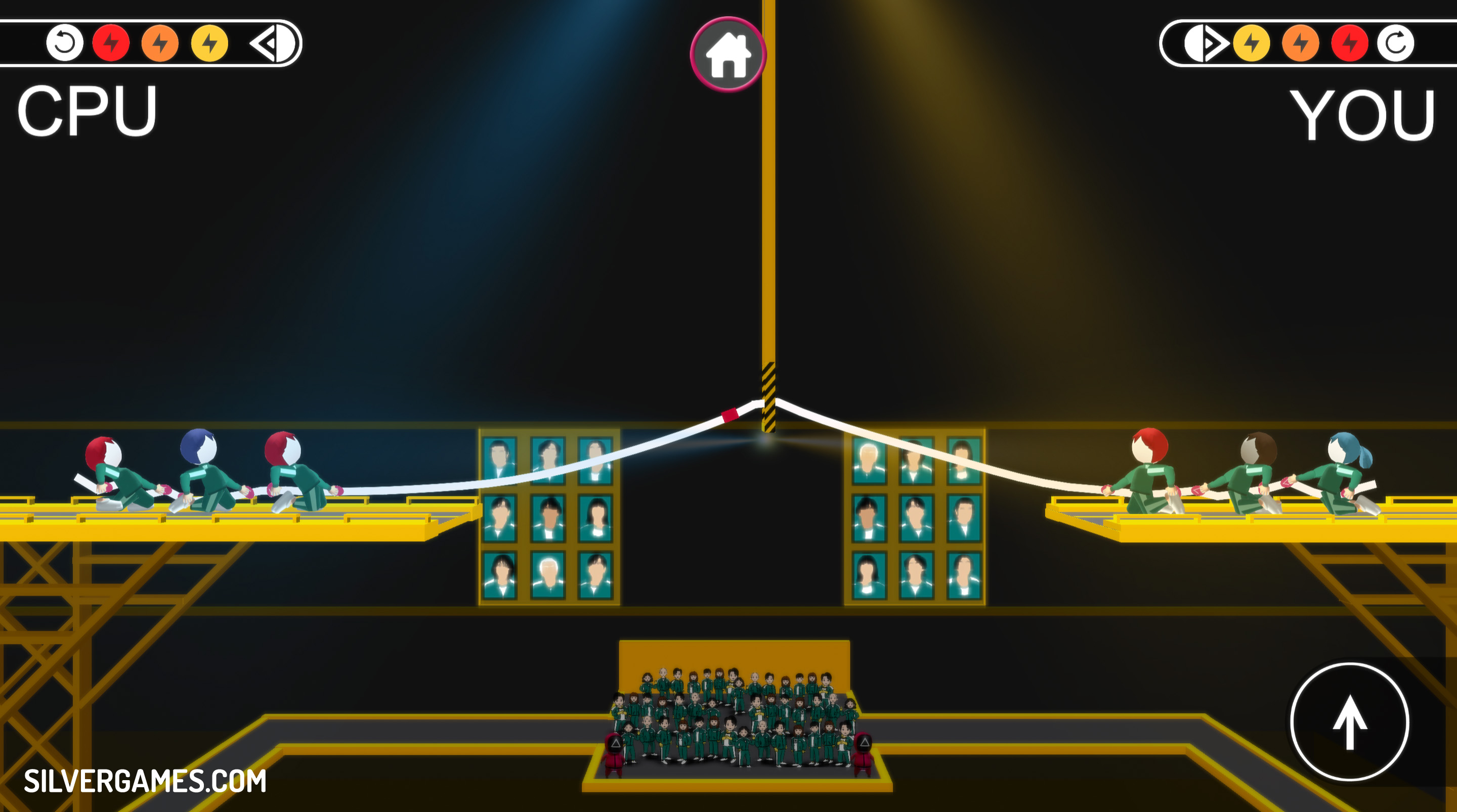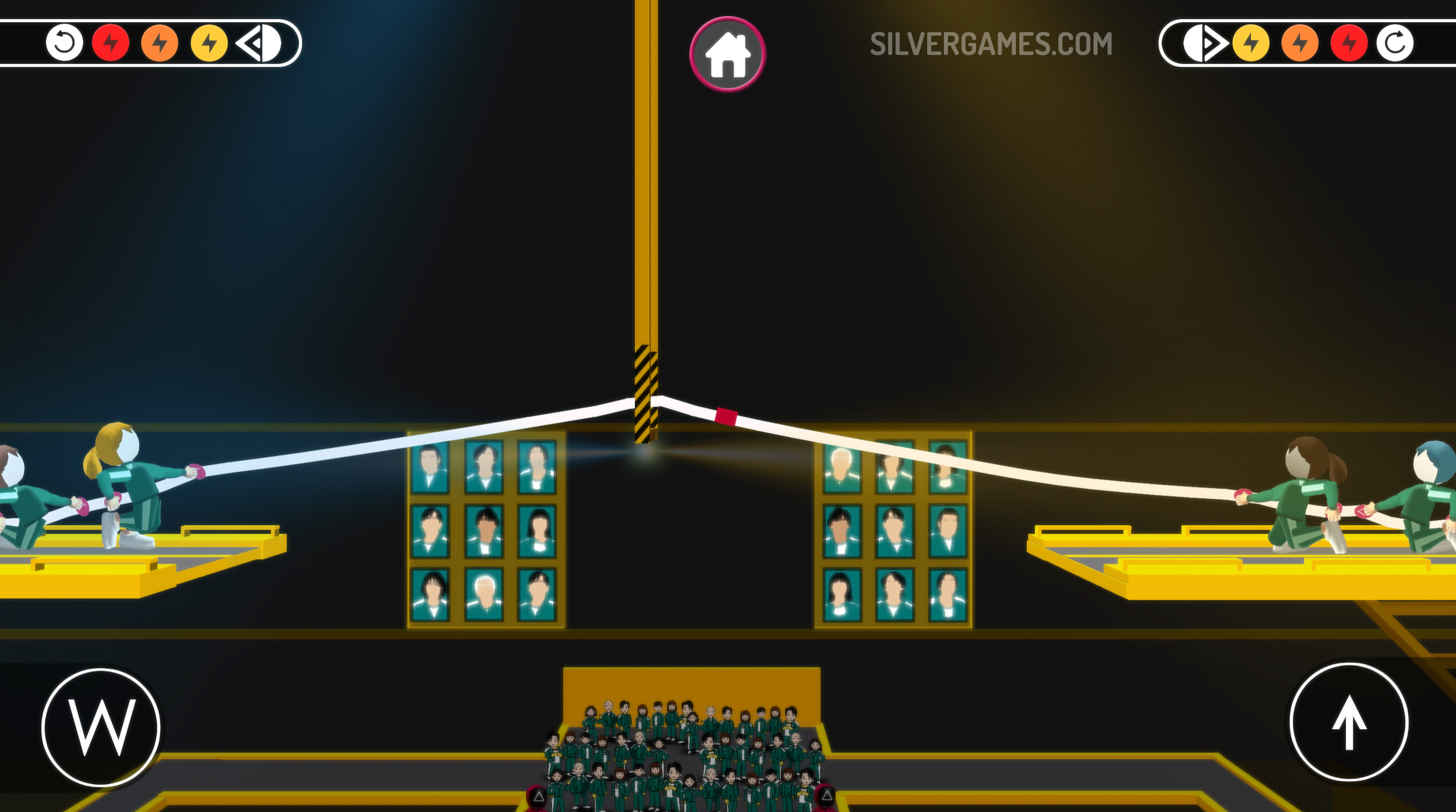 Tug of War: 2 Player is the perfect game to test your strength in the style of the popular TV series Squid Game. Here you can take on the CPU and find out who is stronger. Pull the rope by clicking the up arrow as fast as you can to knock the opposing team off the platform to their doom. As soon as you lose a round, three members of your team will be disqualified.