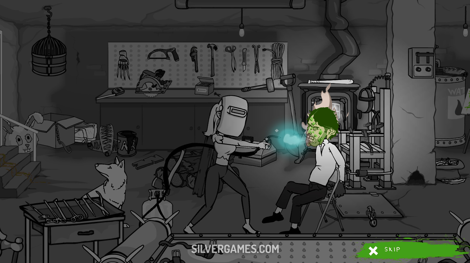 Whack The Serial Killer is a brutal game about the victim of an assault finally striking back! Of course you can play this game online and for free on Silvergames.com. Picture this, you are walking around the neighborhood with your cute boyfriend and your dog, when suddenly a crazy serial killer takes you and your dog to torture you in a creepy basement full of bloody tools, but doesn’t notice you untied yourself free. What do you do? Of course, Whack The Serial Killer! In this gory point and click game you have to find all kinds of ways to kill the masked maniac, like an electric chair, an axe or just blow his twisted brains out with a shotgun.